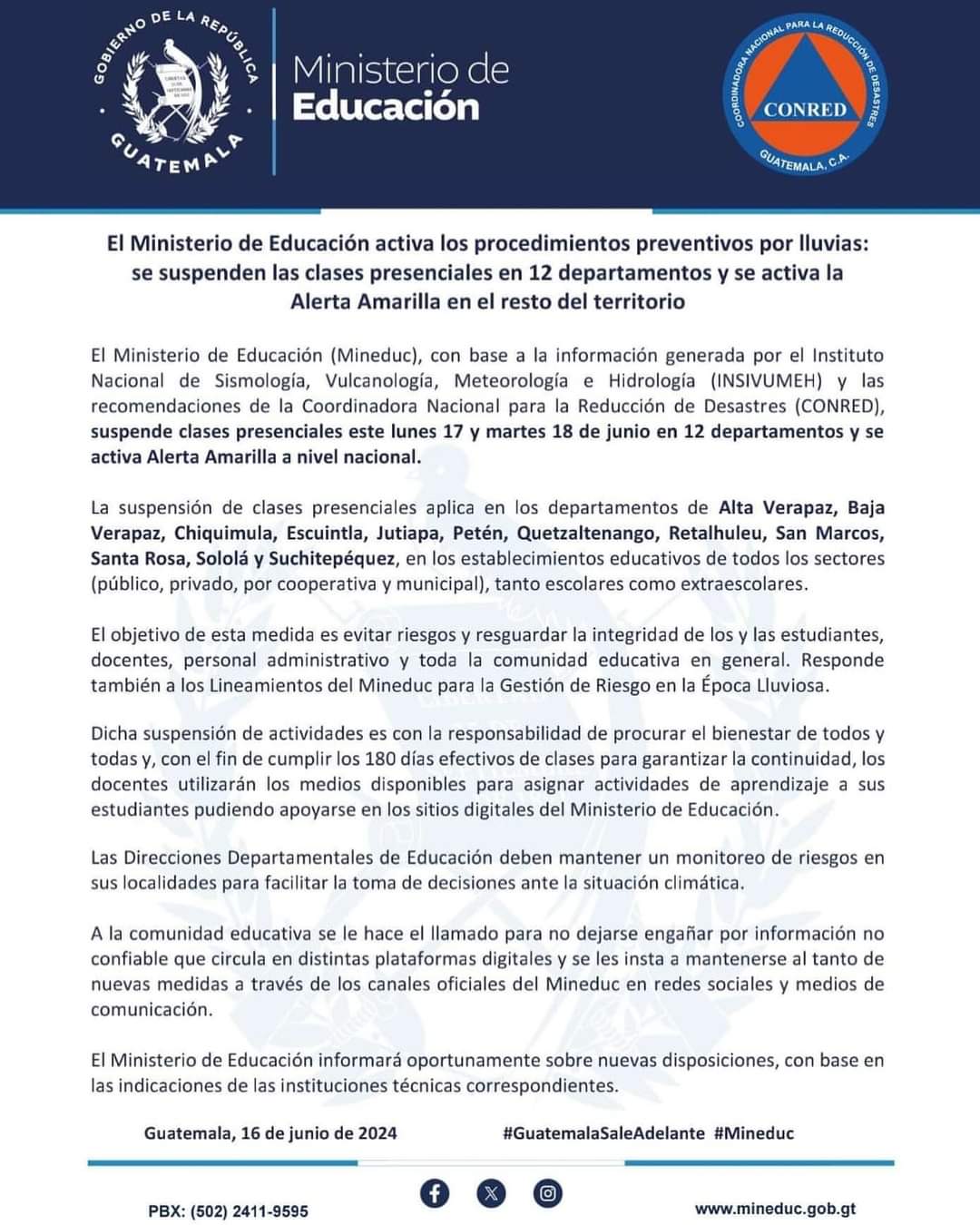 Suspensión de Clases en 12 Departamentos incluyendo San Marcos